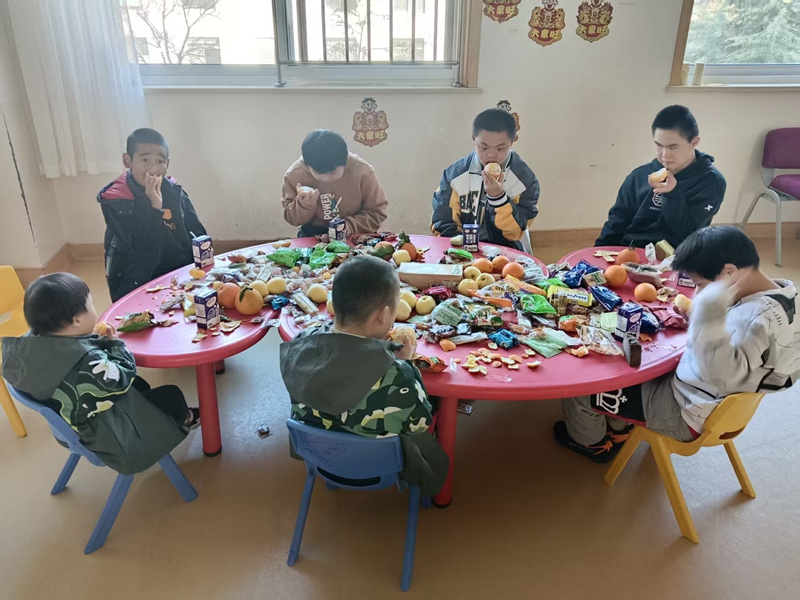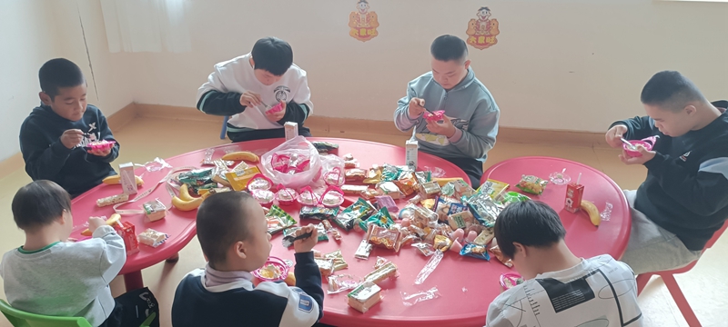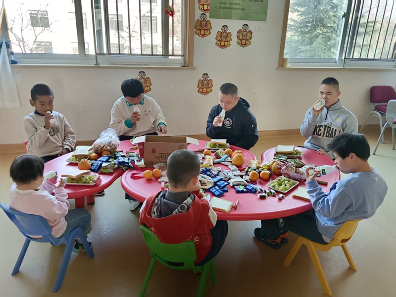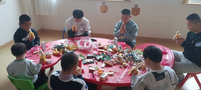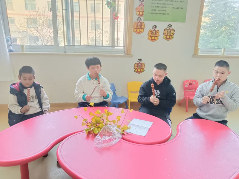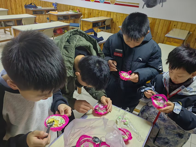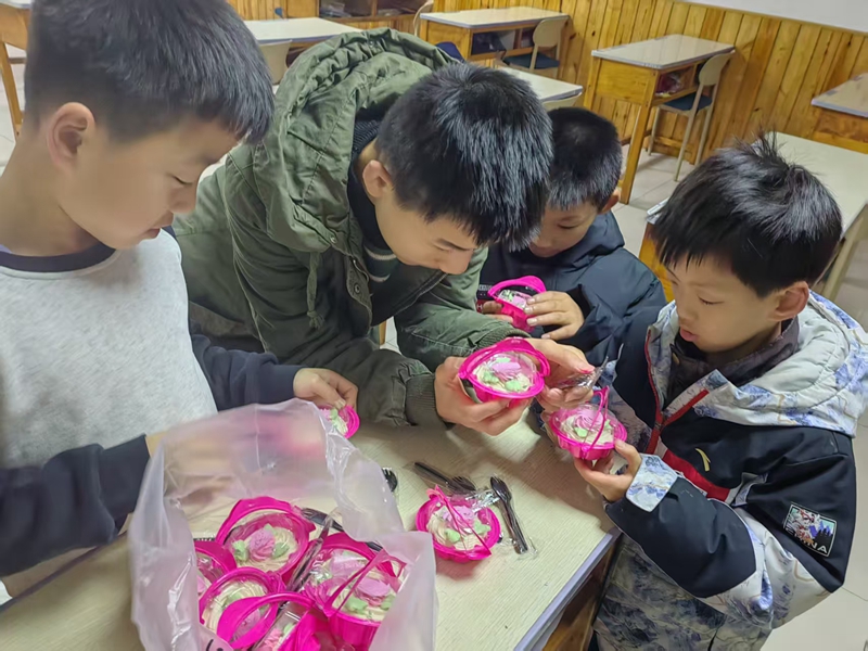 儿童品尝收到的煎饼、大葱、芝麻糊和糖葫芦,并阅读爱心信件。