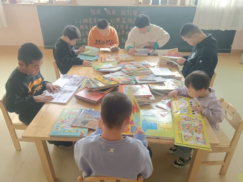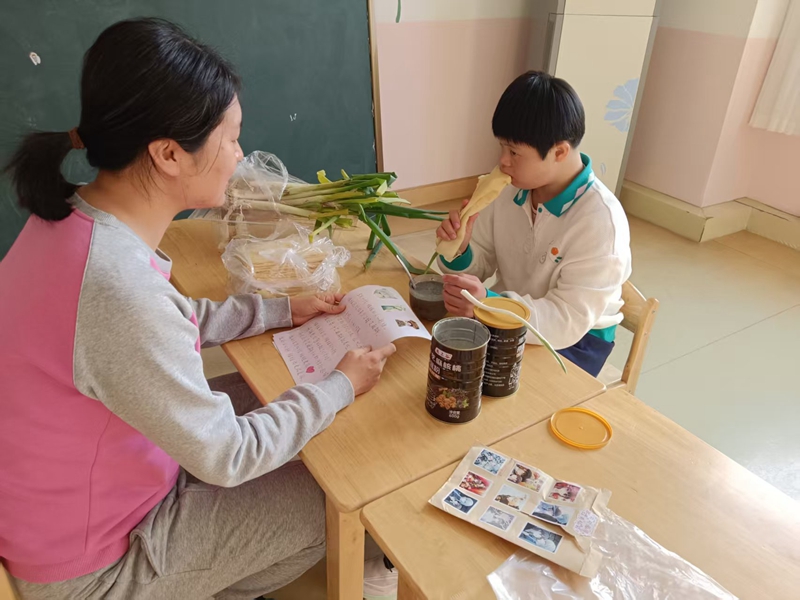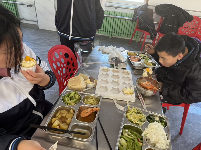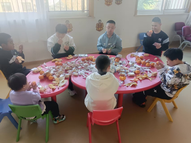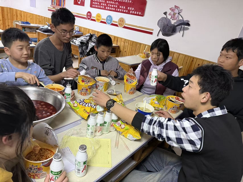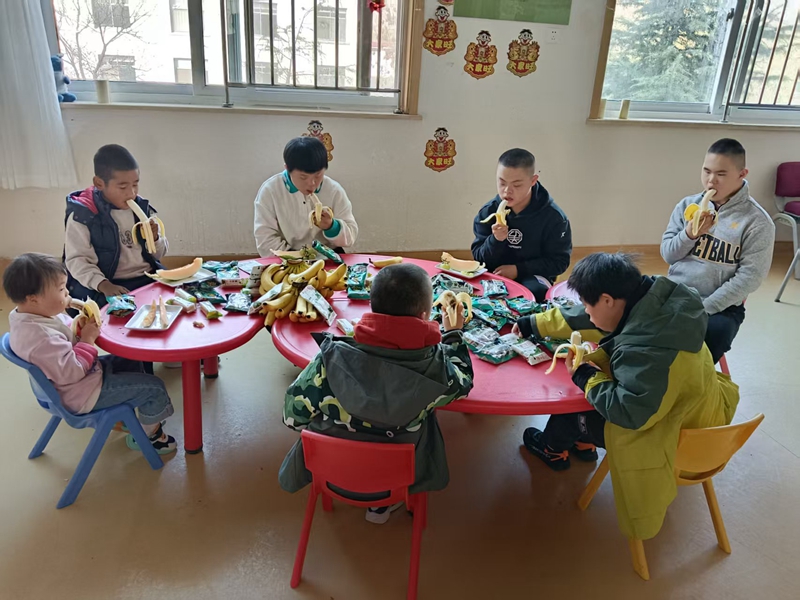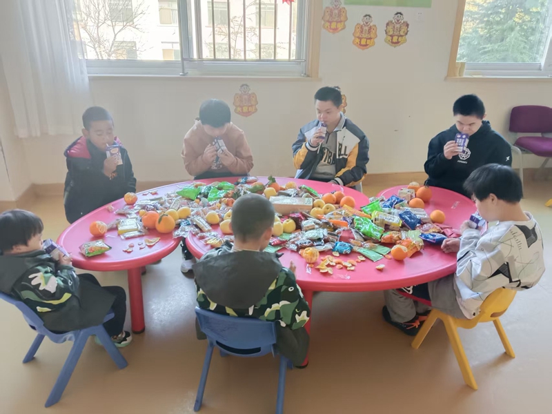 儿童品尝收到的煎饼、大葱、芝麻糊和糖葫芦,并阅读爱心信件。
