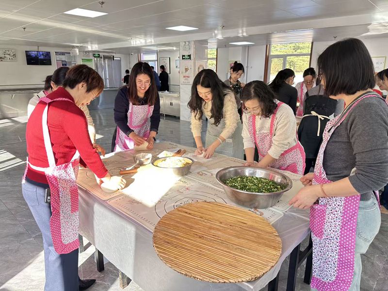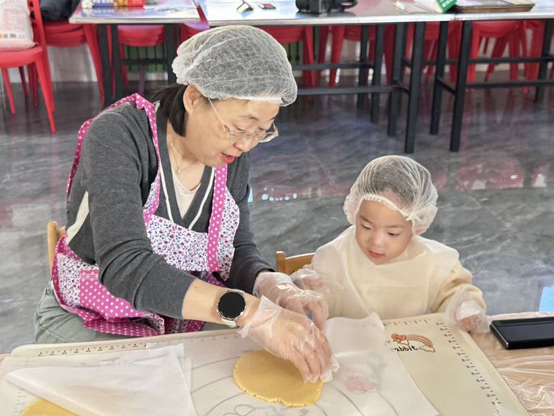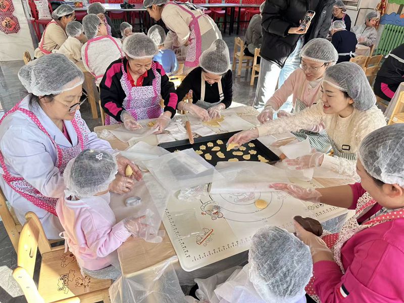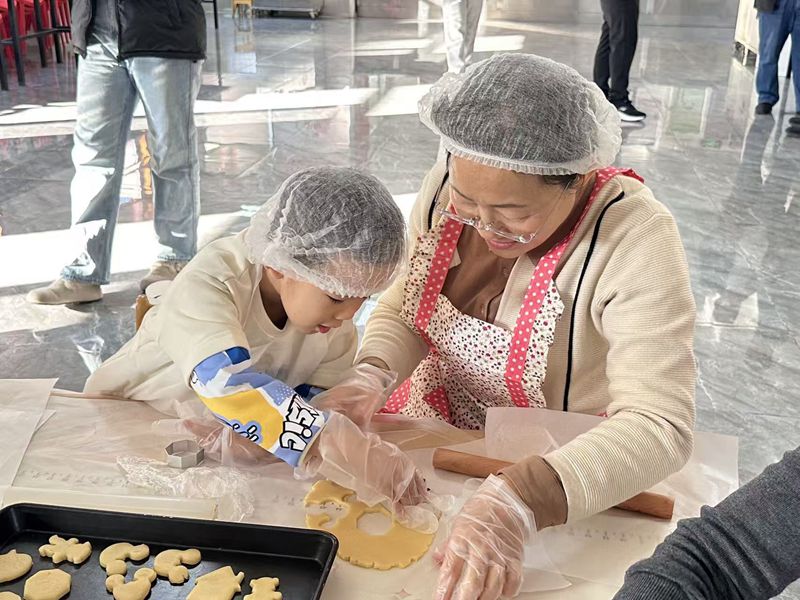活动现场暖意融融,处处洋溢着喜庆祥和的节日氛围。和面、擀皮、调馅,职工们分工协作、有条不紊,孩子们则围在身边,有的踮着脚尖认真观摩,有的跃跃欲试伸手帮忙。一双双小手跟着职工的动作,将圆润的饺子皮捏出可爱的褶皱,形态各异的饺子摆满了托盘,每一个都包裹着满满的爱与关怀。另一边的饼干制作区更是热闹非凡,孩子们在职工的指导下,用模具将面团压出星星、爱心、小动物等各式各样的造型,再点缀上甜甜的糖霜。大家一边创作一边分享趣事,稚嫩的笑声回荡在活动室的每一个角落。
