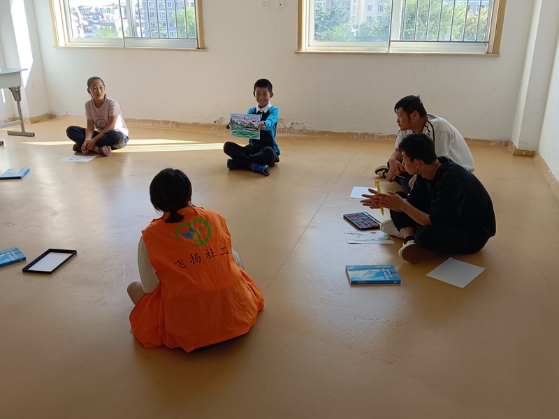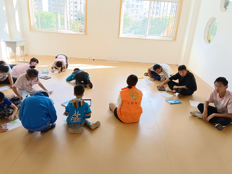 活动现场,孩子们围坐成圈,在飞扬社工和心理老师的引导下,从一场轻松的心灵对话开启旅程。大家敞开心扉,分享内心的小秘密,在温馨的氛围中建立信任。随后,孩子们拿起画笔,在画纸上尽情描绘心中的世界——有的画出了绿意盎然的山水,有的创作了充满童趣的卡通形象,还有的用色彩斑斓的图案表达着对未来的憧憬。