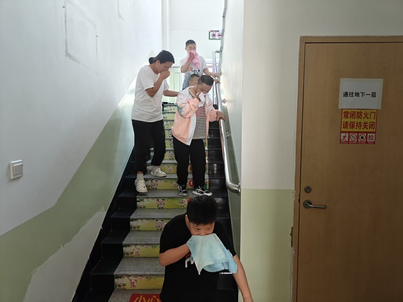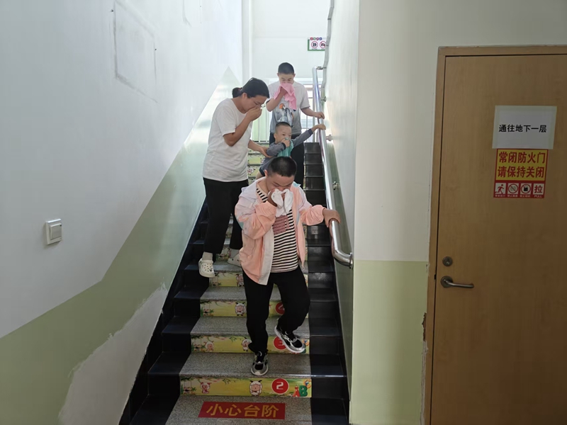 一阵尖锐的火情警报声骤然响彻院区,演练正式开始。最先发现“火情”的职工即刻响应,熟练开展初期火灾扑救,为人员疏散争取缓冲时间。各寝室及生活区域内,职工与老师迅速进入“战斗状态”,手把手指导孩子们做好防护:用湿毛巾严密捂住口鼻,保持弯腰低姿的逃生姿势,沿着既定的安全通道快速撤离。疏散过程中,工作人员一边维持队伍秩序,一边柔声安抚孩子情绪,及时提醒“慢一点,别着急”,确保撤离队伍紧凑而不混乱,稳步向操场集结点推进。针对行动不便的儿童,职工迅速上前,或背或抱,小心翼翼地将他们护送至应急避难小屋,实现全员安全转移。