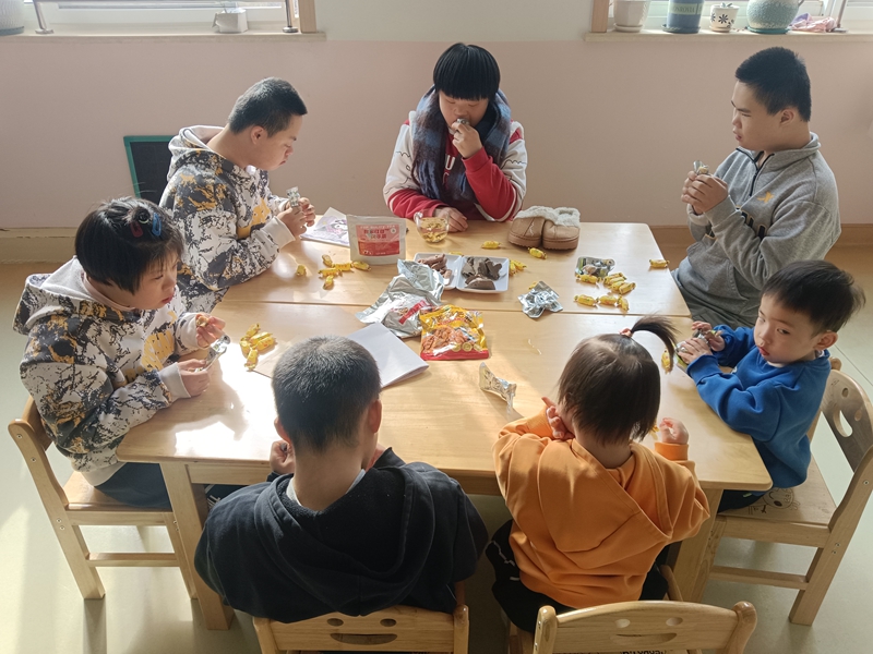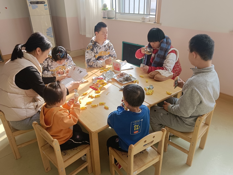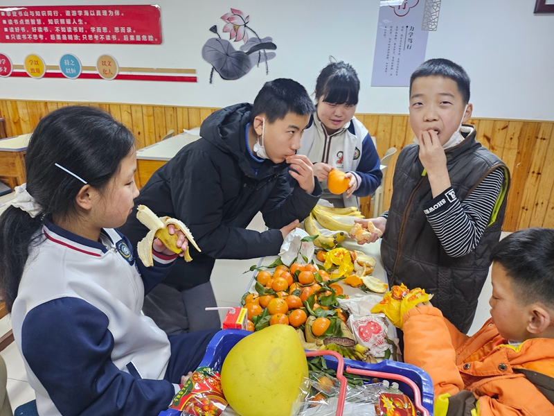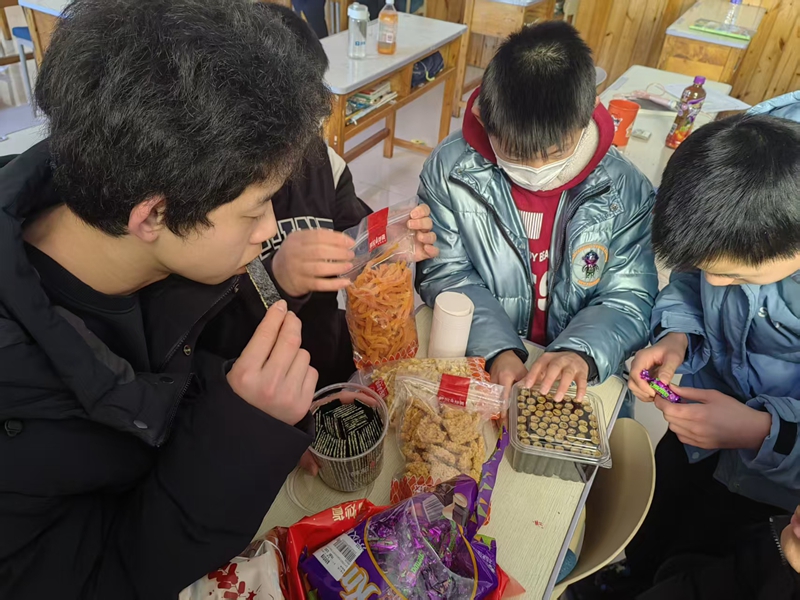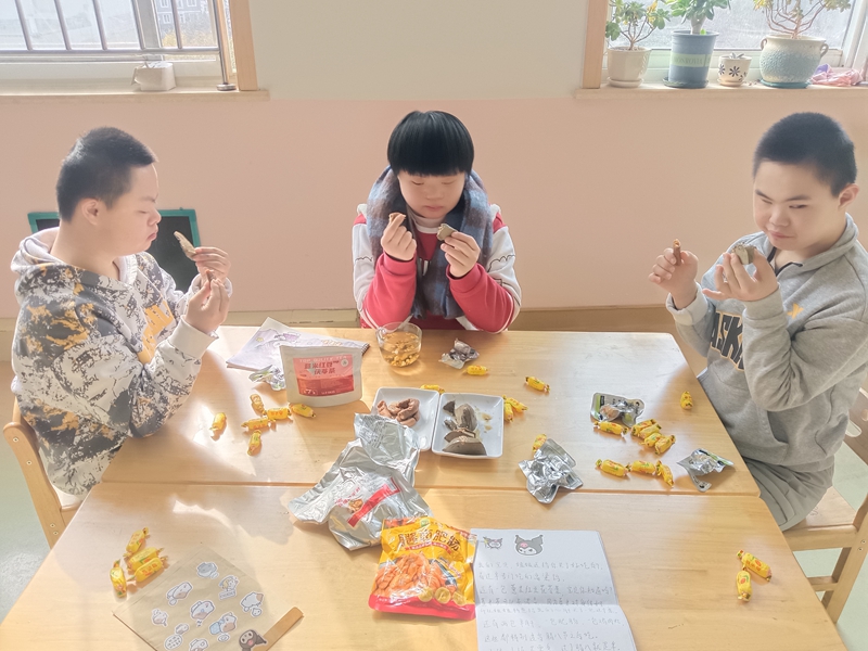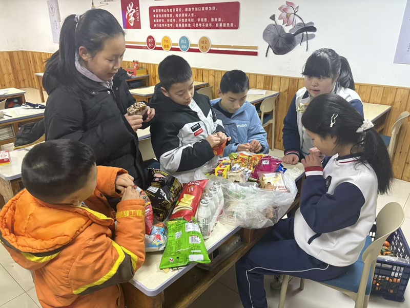 儿童阅读爱心信件、品尝熟食和零食糖果。