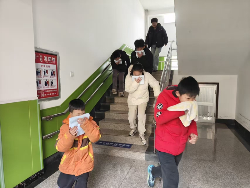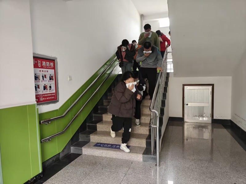 演练开始,警报声准时响起。在工作人员的引导下,孩子们用湿毛巾捂住口鼻,弯腰低姿、快速有序地沿安全通道撤离至指定区域。全程紧张规范、秩序井然,达到了快速疏散、沉着应对的演练目标。