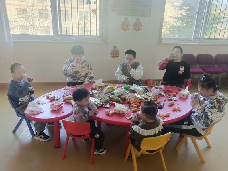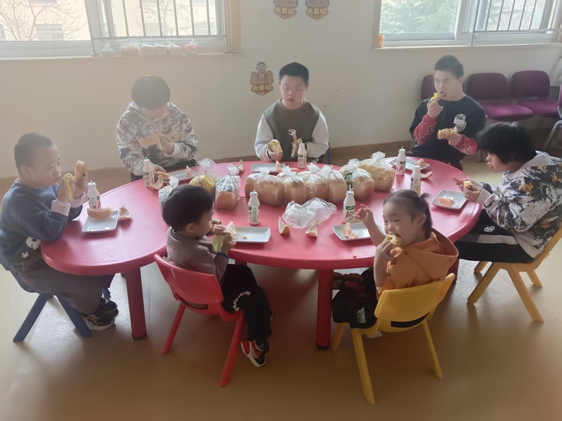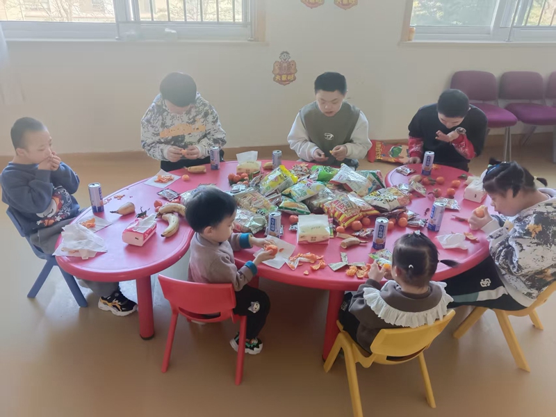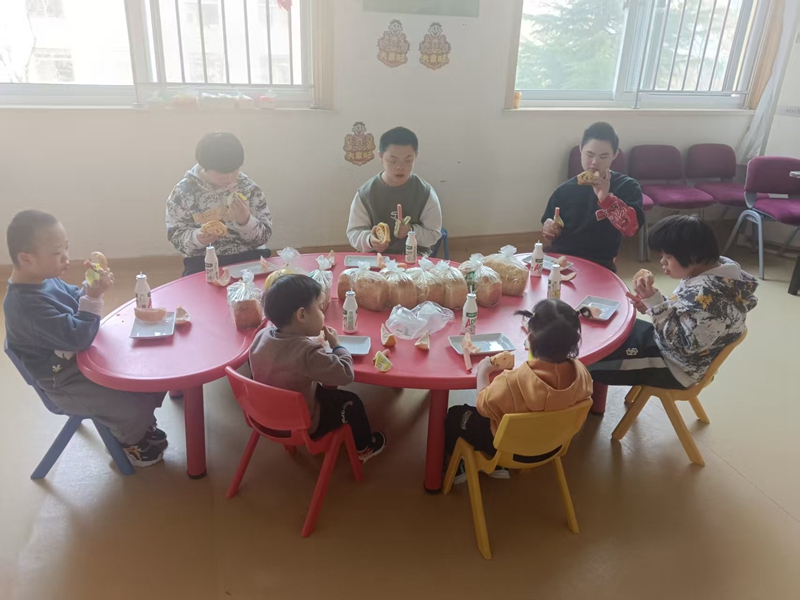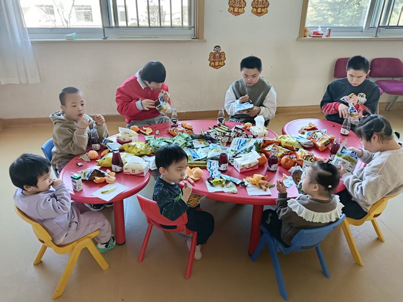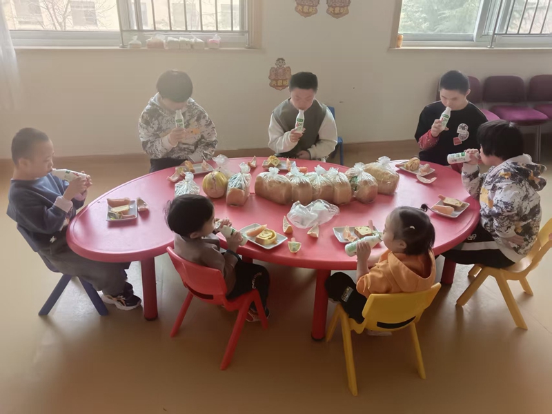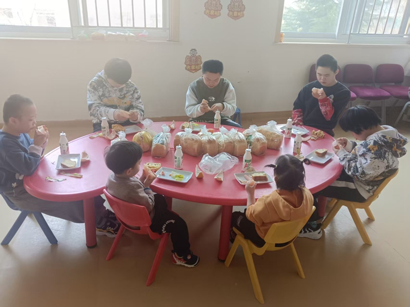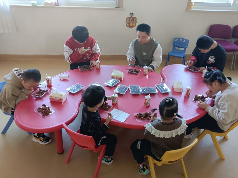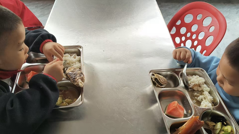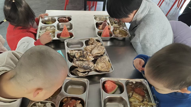 儿童加餐吃海蛎子、汉堡包、烤肠、八宝粥和面包