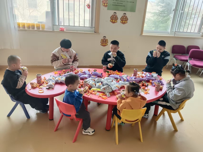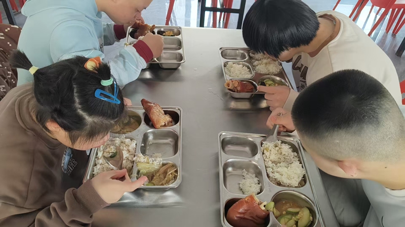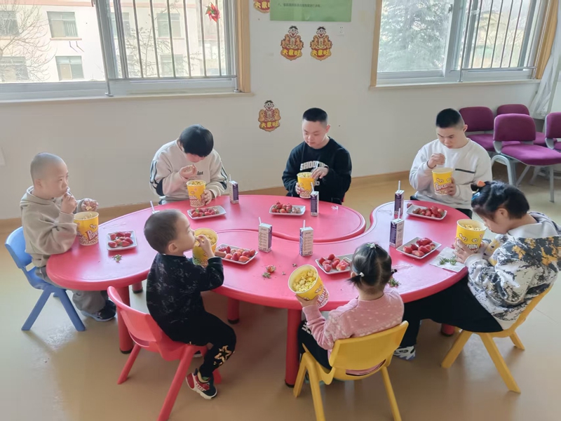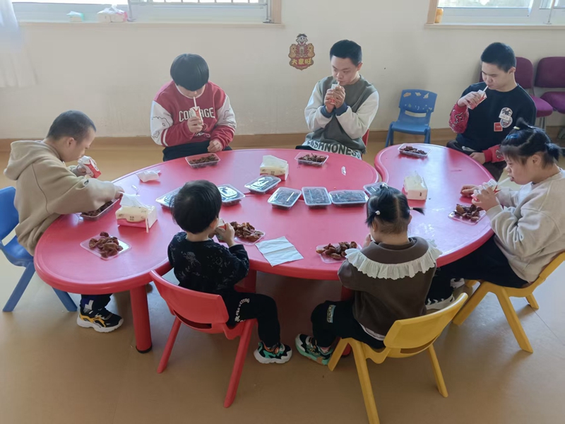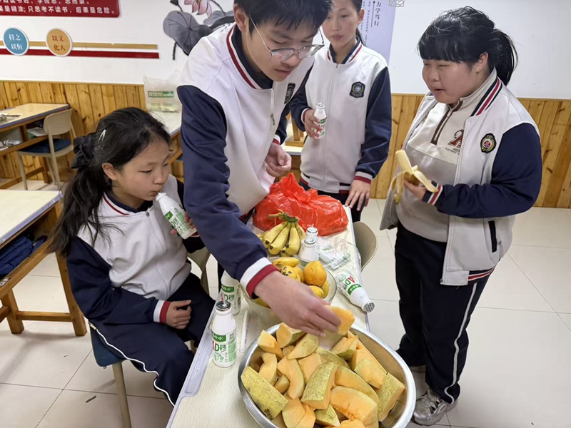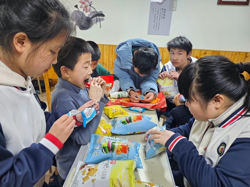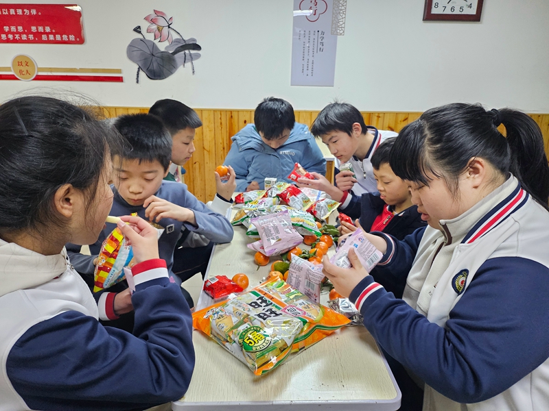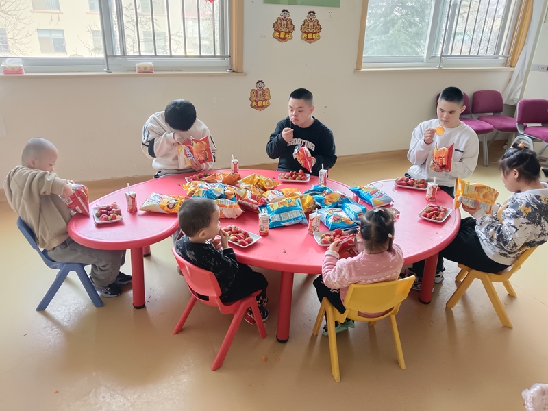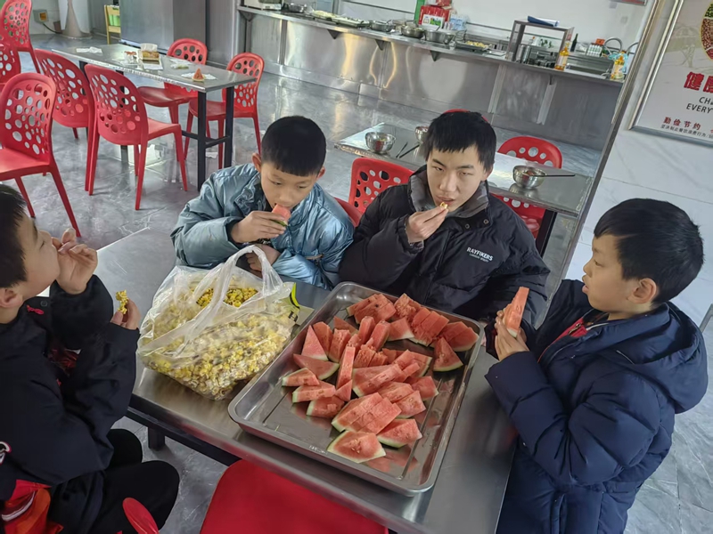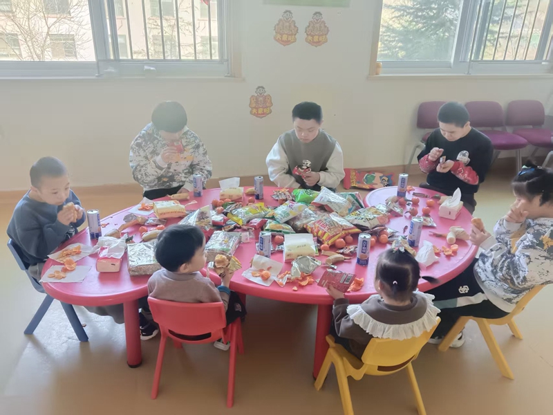儿童加餐吃海蛎子、汉堡包、烤肠、八宝粥和面包
