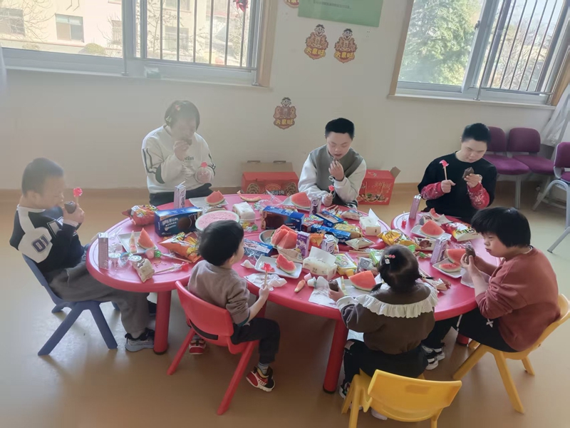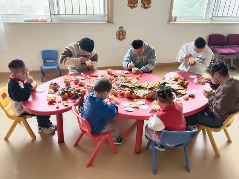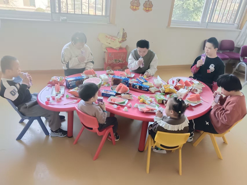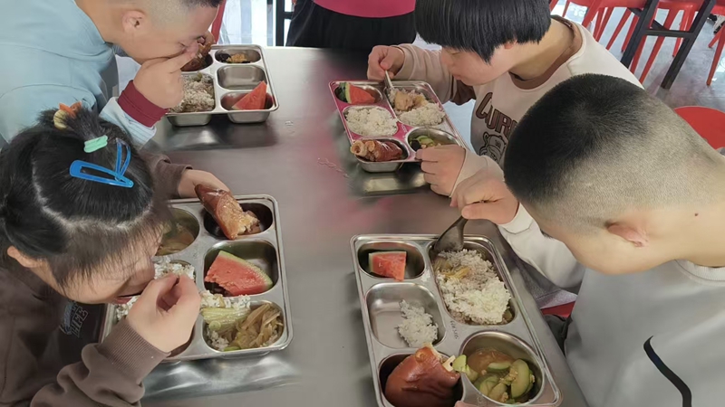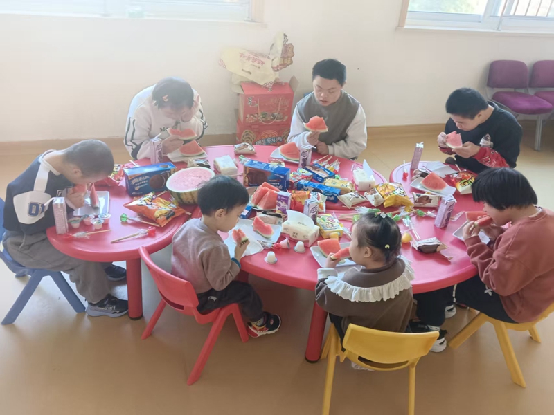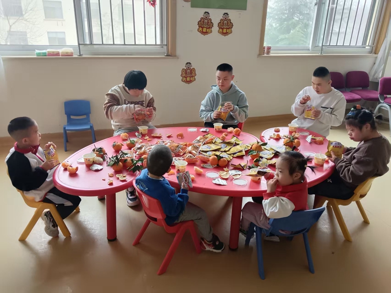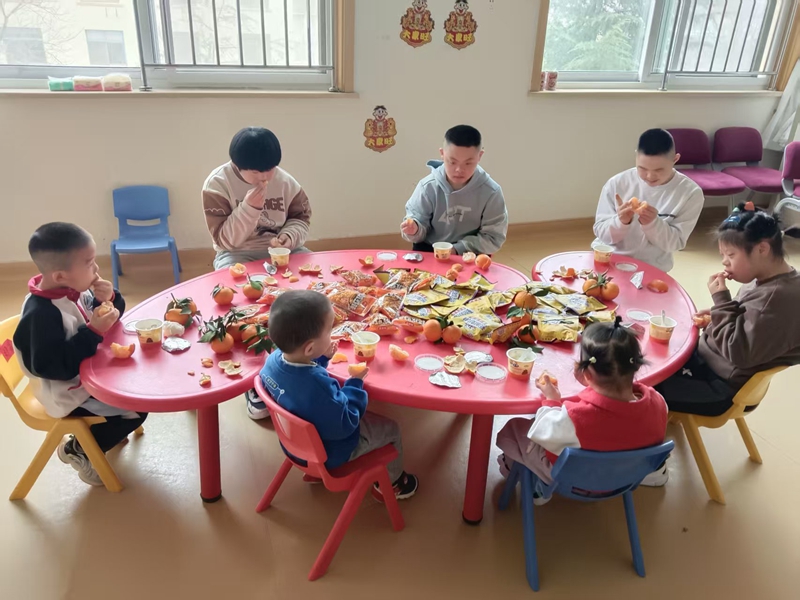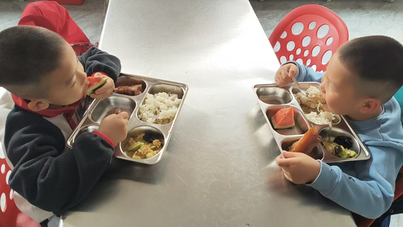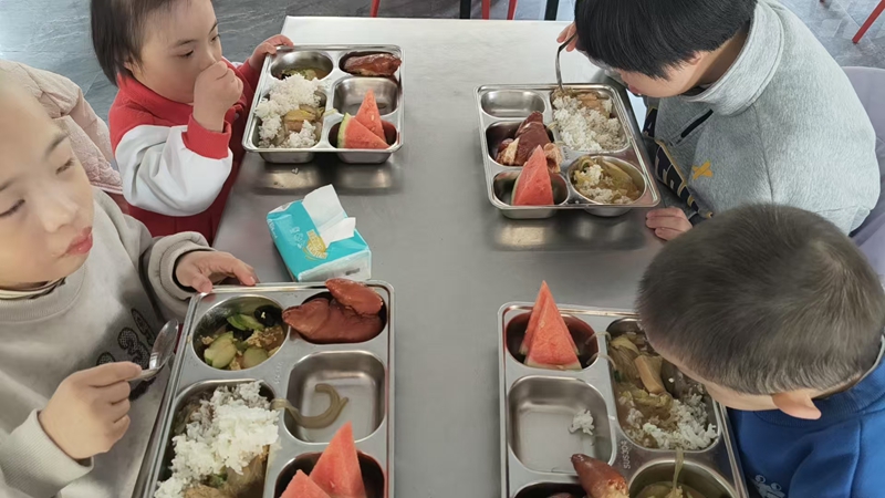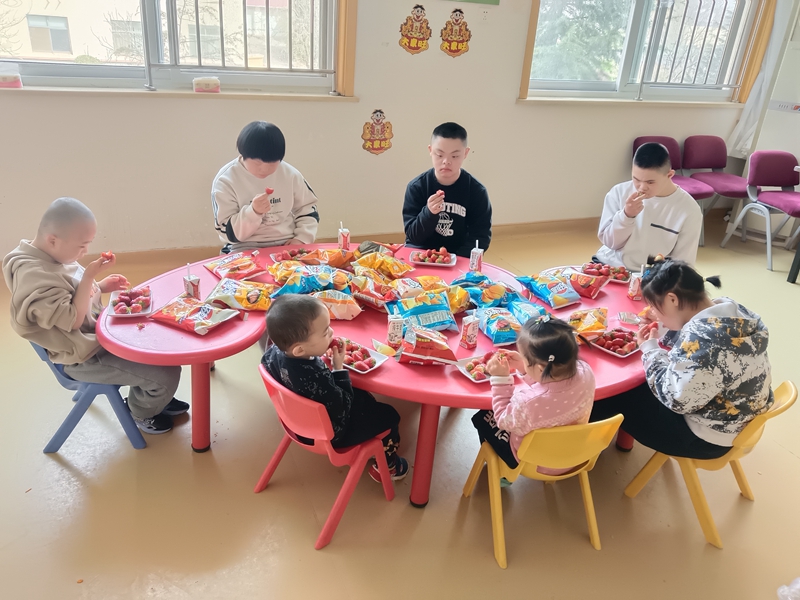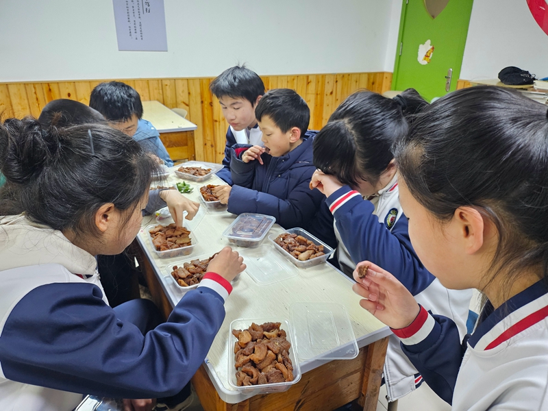 儿童加餐吃海蛎子、汉堡包、烤肠、八宝粥和面包